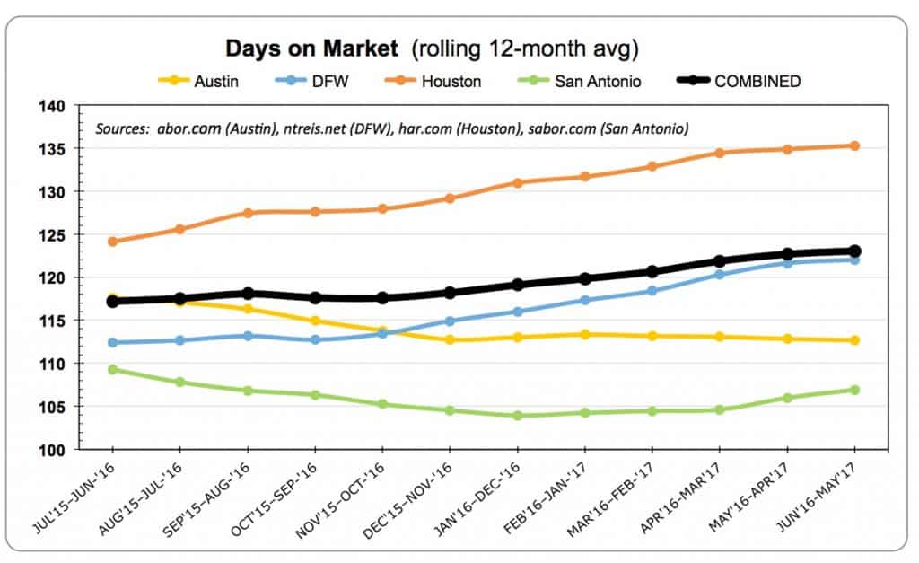 Overall, in the combined four largest new home sales markets in Texas, the overall pace of new home sales has been slowing steadily since last October, according to HomesUSA.com®, as the average number of Days on Market in the four Texas markets increased from 117.58 days in October 2016, to 123 days last month, May 2017.