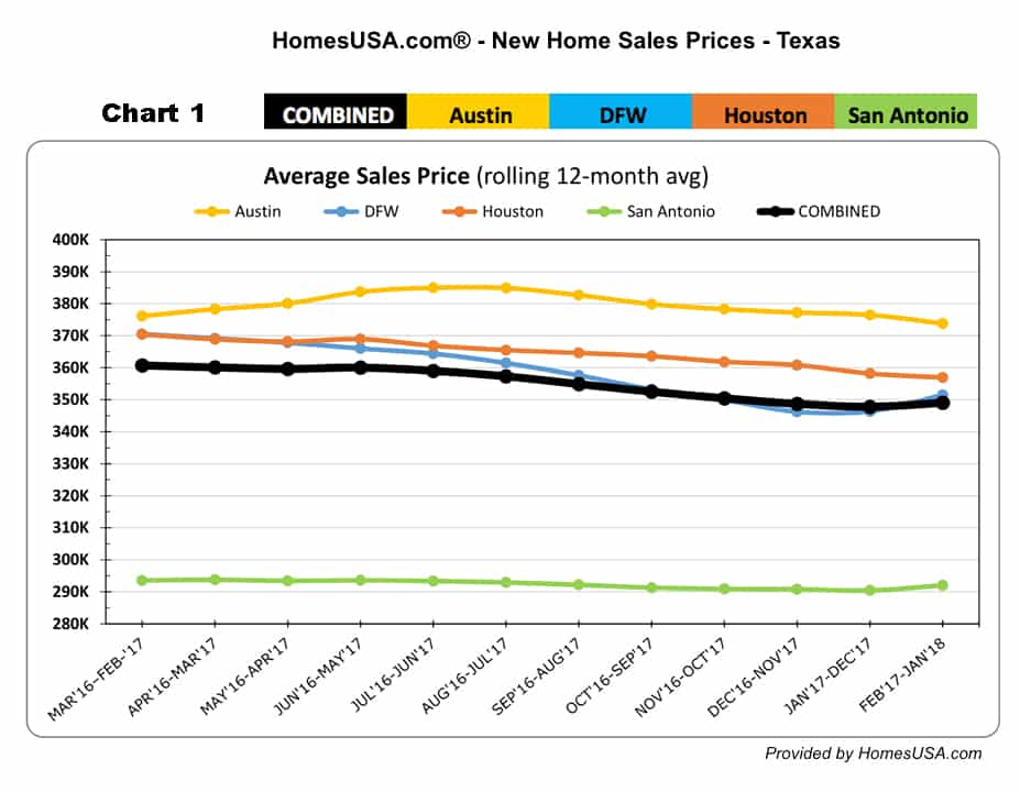 In Houston, the average new home sales price dropped from $358,173 in December to $356,928 in January. In Austin, the average price fell from $376,482 in December to $373,795 in January.