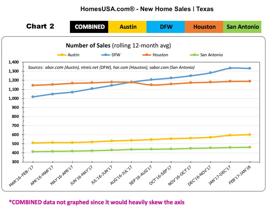 While new home sales were higher in three-of-four of the Texas major housing markets last month, the amount of the increase suggests new home sales are stabilizing. The rolling 12-month average of home sales statewide increased from 3,573 in December to 3,585 in January. That’s according to data compiled by HomesUSA.com® from local MLS and trade associations, including the Houston Association of REALTORS®, North Texas Real Estate Information Systems, San Antonio Board of REALTORS® and the Austin Board of REALTORS®.