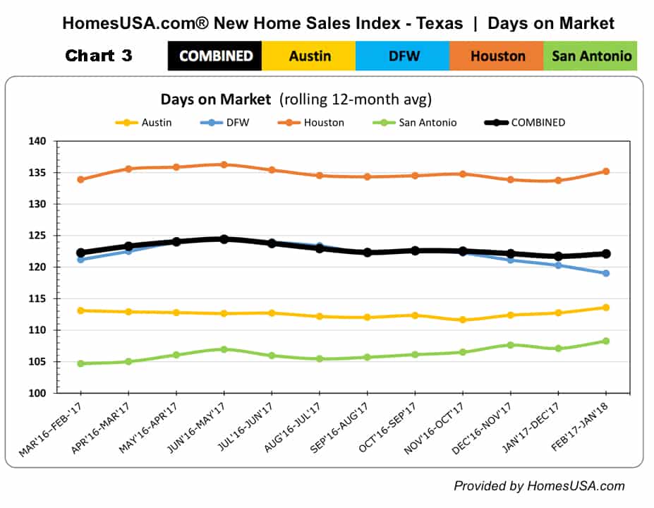 In Dallas-Fort Worth, the DOM decreased from 120.27 days in December to 119.02 days in January. In Houston, the average for new homes increased from 133.75 days in December to 135.18 days in January, while in San Antonio, the average DOM rose from 107.11 days in December to 108.27 days in January. In Austin, the DOM increased from 112.75 days in December to 113.60 days in January.