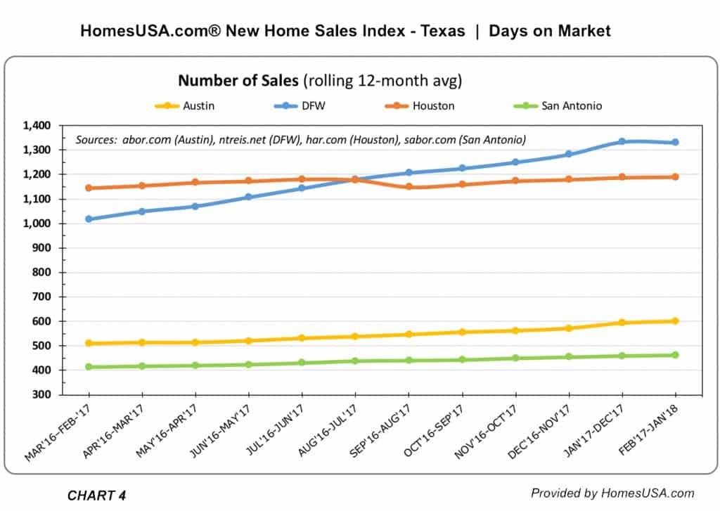 New home prices rose for the first time in the last ten months as total new home sales stabilized and the pace of home sales slowed in three of the top four major Texas markets, according to the HomesUSA.com® New Homes Sales Index and other data released today. The Index is a 12-month rolling average of the Days on Market (DOM) for new homes listed in the local Multiple Listing Services (MLSs) for the four largest Texas markets, including Dallas-Ft. Worth, Houston, Austin, and San Antonio.