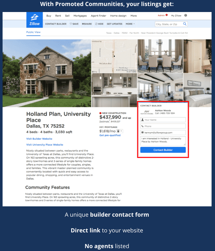 Zillow launched Promoted Communities in January 2016 but didn’t announce it publicly until October 2016. The press release referred to it as an “exclusive advertising platform” but did not mention the policy change to start charging builders for listing publication explicitly. Zillow says it reached out to builders, MLSs and brokers — customers and partners who were directly impacted — across the country to let them know individually rather than publicly. Inman was alerted to the change by Ben Caballero, who is known for being the no. 1 top-producing agent in the country and specializes in working with homebuilders.