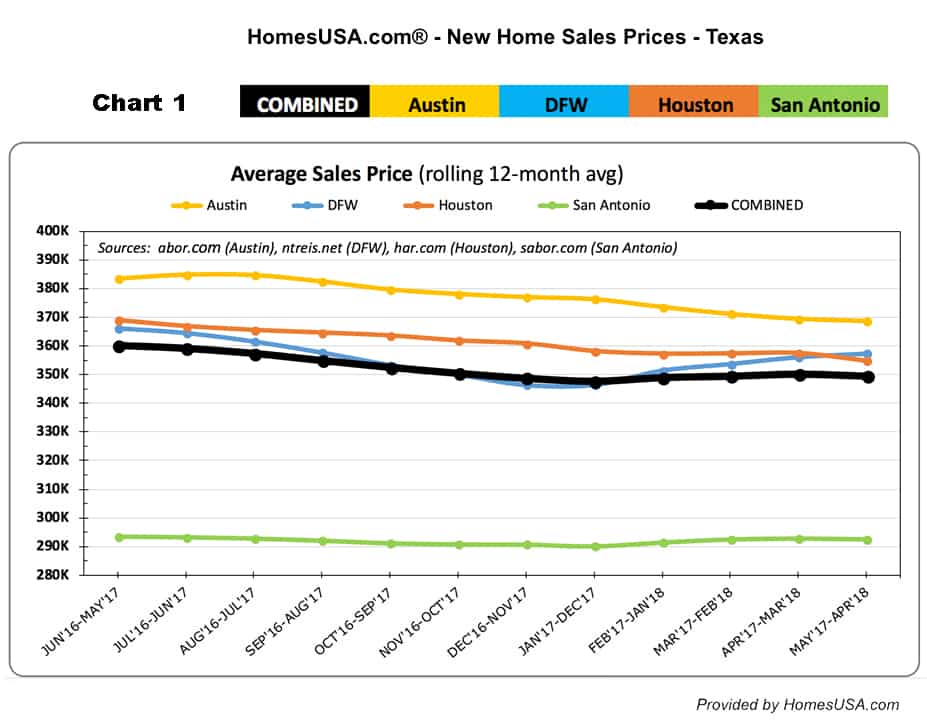 Dallas-Ft. Worth average new home prices went higher in April, climbing from $356,108 in March to $357,340. Houston’s average new home prices fell significantly, from $357,414 in March to $354,750. In Austin, the average new home price fell slightly from $369,407 in March to $368,643 in April. The average new home price in San Antonio dropped slightly $292,866 in March to $292,648 in April. (See Chart 1 – Texas New Home Sale Prices)