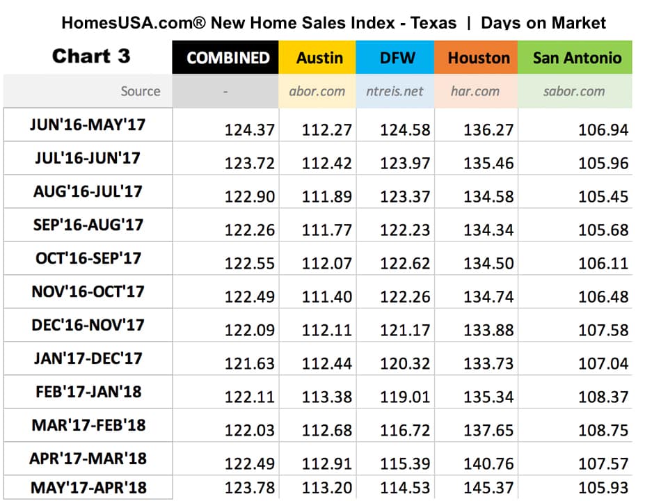 The HomesUSA.com Index is a 12-month rolling average of the Days on Market (DOM) for new homes listed in the local Multiple Listing Services (MLSs) for the four largest Texas markets, including Dallas-Ft. Worth, Houston, Austin, and San Antonio.