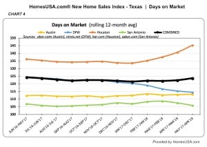 The HomesUSA.com® New Home Sales Index is the first index to track new home sales. Created by Caballero, who was named “Most Innovative Real Estate Agent” by real estate news firm Inman News, the index is an analysis by HomesUSA.com of sales of homes listed in the Dallas-Fort Worth, Houston, Austin and San Antonio local Multiple Listing Services (MLS). (See Chart 4 – New Home Sales Index – Days on Market – Tracking)