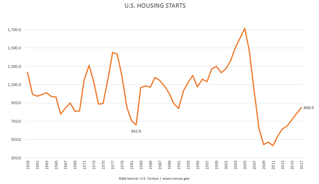 - In the 9th year of the housing recovery, 1982 was the last year a housing start number was lower than 2017, present recovery excepted (see chart below)