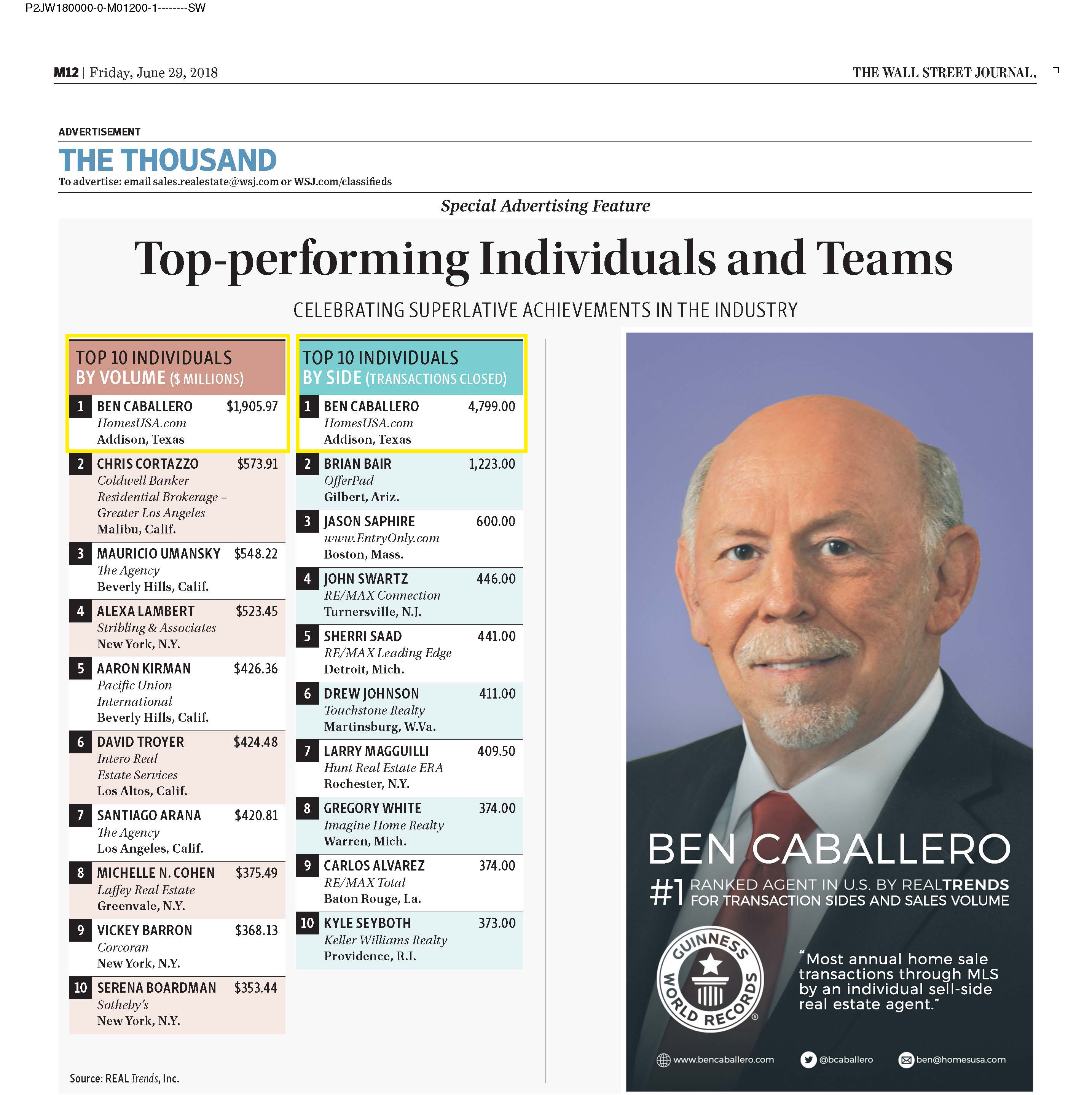 Ben Caballero tops RealTRENDS’ “The Thousand List” for 2018 as the number one realtor in sales volume (in the millions) and number of transactions closed.