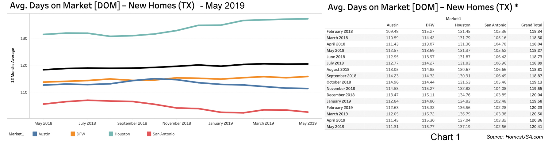 Chart 1: Texas New Homes Tracking – Days on Market – May 2019: