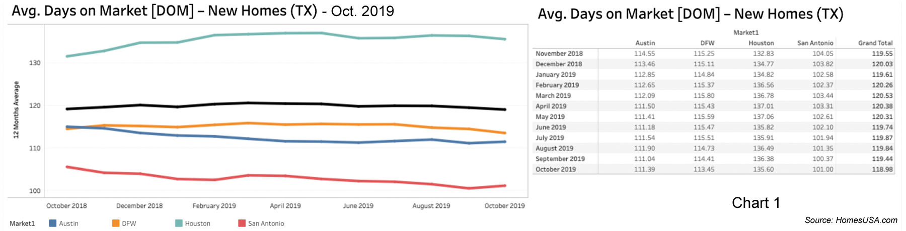 The state’s top two new home markets – Houston and Dallas-Ft. Worth – reported fewer Days on Market, the opposite was true in Austin and San Antonio. According to the HomesUSA.com New Home Sales Index, both Austin and San Antonio saw their Days on Market increase, indicating a slight slowing in sales pace. The DOM for Austin was 111.39 days in October versus 111.04 days in September. In San Antonio, the DOM was 101 days in October versus 100.37 days in September. Statewide, the pace of new home sales also improved, as the average DOM was 118.98 days in October versus 119.86 days in September. (See Chart 1: Texas New Homes Days on Market)