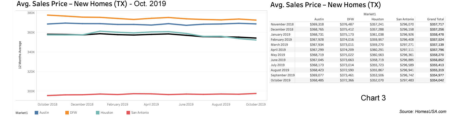 Home buyers benefited from lower new home prices in Texas. The 12-month rolling average of sales price for October came in at $354,042, down from $354,987 in September and significantly lower than the $357,717 average price posted 12 months ago in November 2018.
